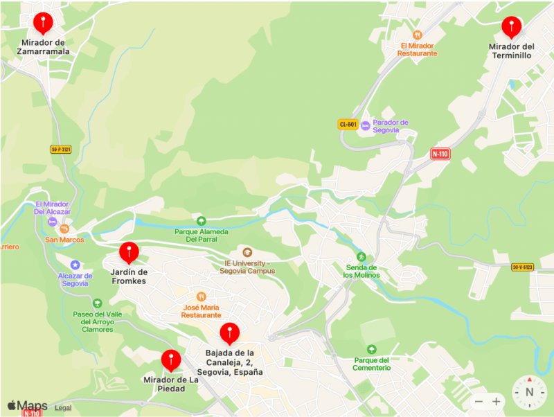 ラ・ラストリージャとパラドールから下る道の脇に広がるこの場所は、セゴビア北側一帯を見渡せる絶好の展望地です。ここからは、アルカサルを舳先、カテドラルの塔をメインマスト、水道橋を本土につなぐ舫いに見立て、サン・サルバドールとサン・フストの塔が際立つ、緑の海に浮かぶ大きな石造りの船のようなセゴビアの姿を眺めることができます。