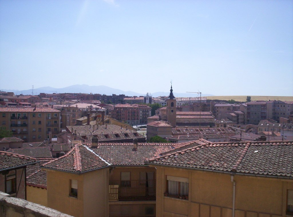 背景には、セゴビアの人々が「悪魔が水道橋の石を切り出した」と語り継ぐシエテ・ピコスのギザギザの峰々や、円錐形のモントン・デ・トリゴ、さらに伝説の着想源となったムヘル・ムエルタ(「死んだ女」)の横顔など、シエラの山々が青く遠望できます。