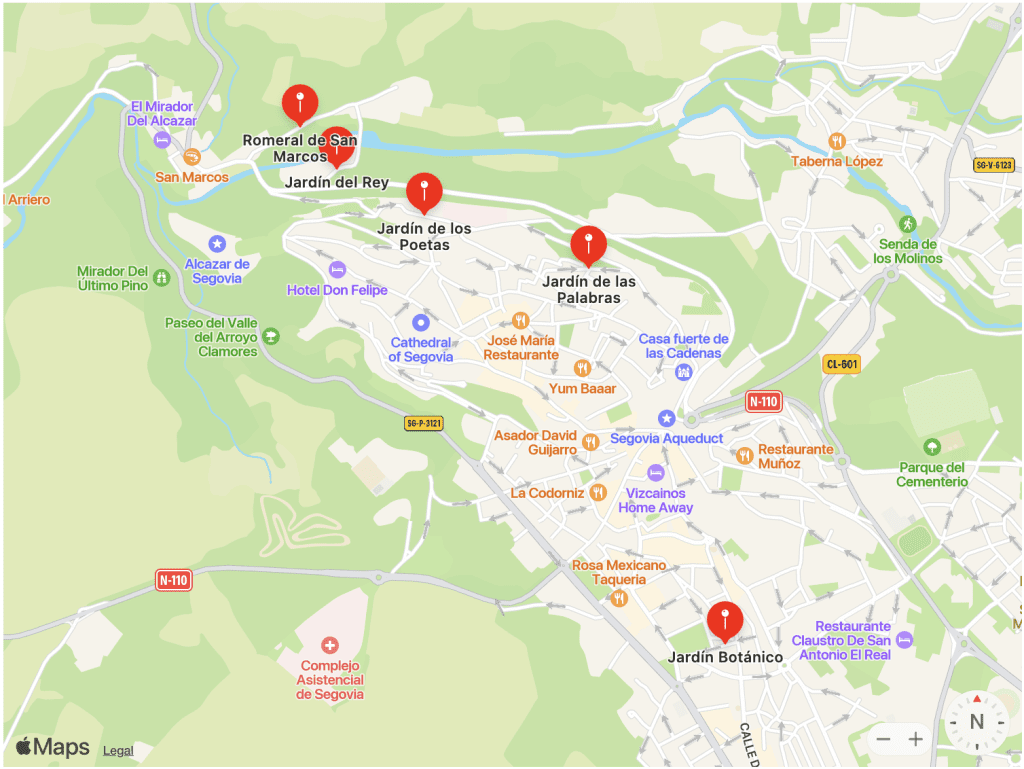 この庭園はアルカサルからわずか5分、サンティアゴ門に隣接する恵まれた場所にあります。エレスマ渓谷を見下ろすバルコニーとも言えるこの庭からは、ラ・フエンシスラ聖域、ベラ・クルス教会、サンタ・マリア・デル・パラル修道院、王立造幣局を眺めることができます。